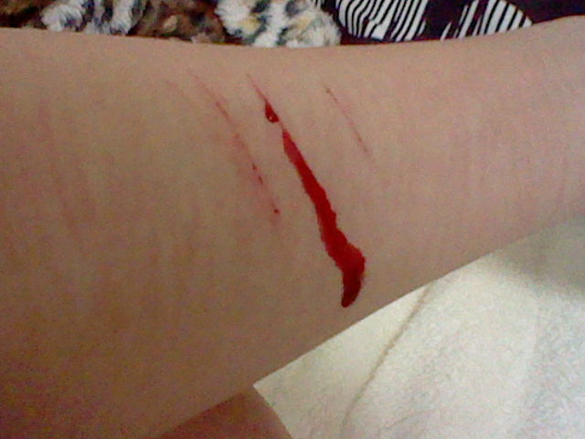 深い傷?これが?カッターで浅く切ればこんなもんだと思うし偏見だけど深く切ったら脂肪層見えると思うんだけど…