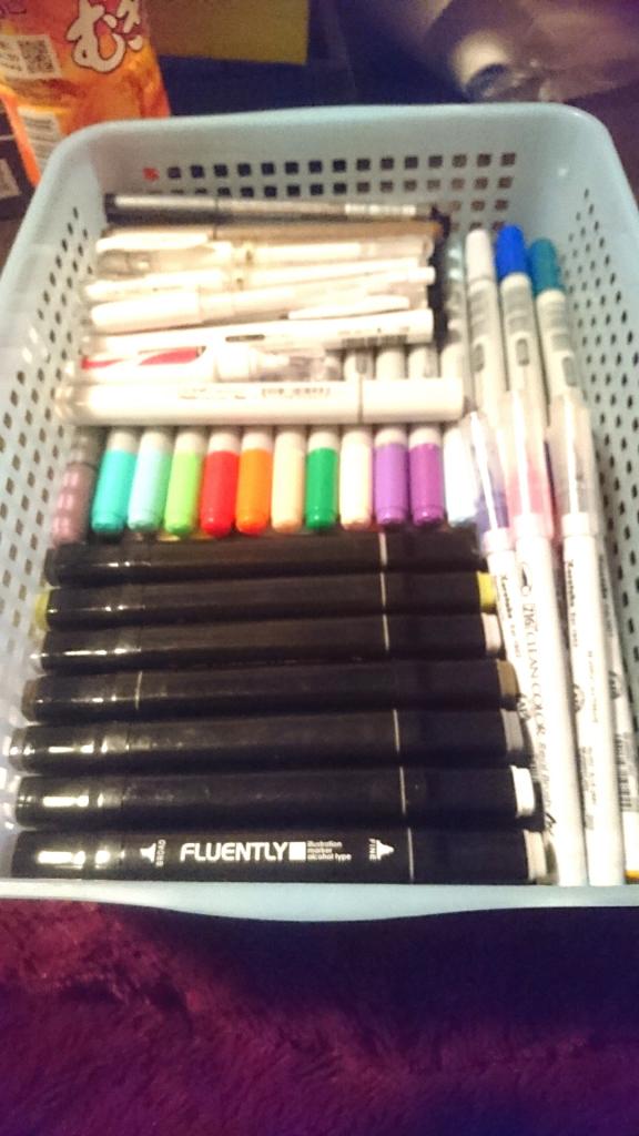 ただ単に箱にコピックとイラストマーカーとハイライト用のペンと線画用のペンを詰めてるだけのくっそとりにくi((((は