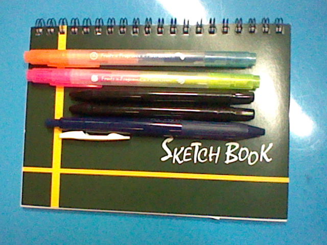 B6スケッチブック、四色蛍光マーカー、HB・2Bスケッチペン、サラサクリップ ネイビーブルー 計500円。