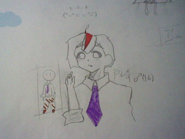 髪…前髪が少し赤に染まっており、アホ毛も下の部分が赤がかっている。ボサボサ。