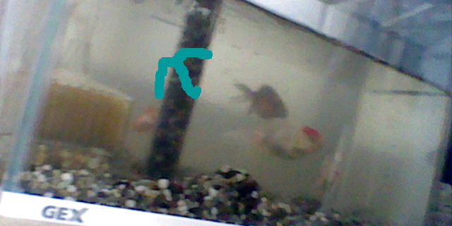家の金魚が一匹死にました。 [本当は矢印のところに一匹いました]